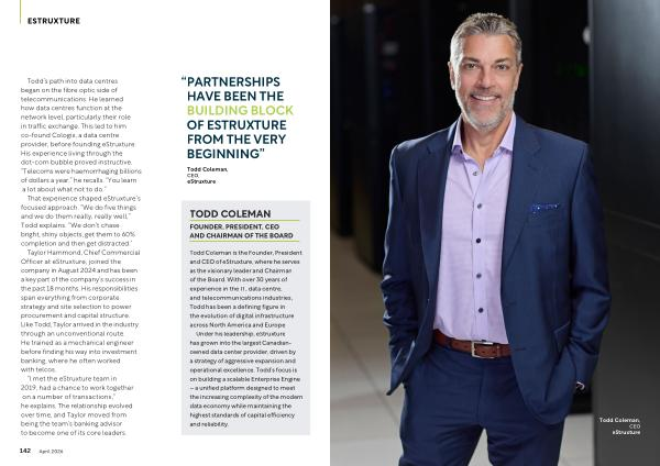 Taylor Hammond, Chief Commercial Officer at eStruxture, joined the company in August 2024 and has been a key part of the company’ s success in the past 18 months. His responsibilities span everything from corporate strategy and site selection to power procurement and capital structure. Like Todd, Taylor arrived in the industry through an unconventional route. He trained as a mechanical engineer before finding his way into investment banking, where he often worked with telcos.
