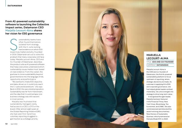 Marjella Lecourt-Alma is the CEO and co-founder of Datamaran, the first AI-powered sustainability platform to focus upstream of reporting, where strategic decisions are made. As a pioneer in applying AI to ESG and corporate governance, she has helped global leaders embed materiality, risk, and oversight into strategy to drive long-term value.