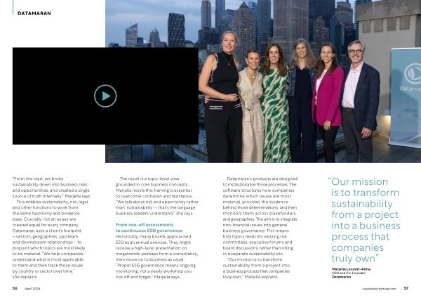 Datamaran’ s products are designed to institutionalise those processes. The software structures how companies determine which issues are most material, provides the evidence behind those determinations, and then monitors them across stakeholders and geographies. The aim is to integrate non‐financial issues into general business governance. This means ESG topics feed into existing risk committees, executive forums and board discussions, rather than sitting in a separate sustainability silo.