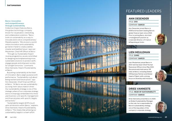 Barco: innovation and competitiveness through sustainability Collective Impact features Barco, the global technology company known for visualisation, networking and collaboration solutions.“ Barco looks at sustainability as a way to innovate and to drive competitiveness,” Marjella explains.“ We envision a world where innovation and sustainability go hand in hand to create a better, smarter and healthier future,” says Lien Meuleman, Chief HR Officer at Barco.“ Through our Sustainable Impact Journey programme, we are committed to designing and implementing more sustainable solutions to protect earth, engage people and empower society for a bright tomorrow,” comments Dries Vanneste, Head of Sustainability at Barco.