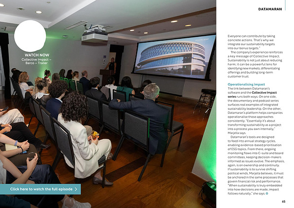 Operationalising impact The link between Datamaran’ s software and the Collective Impact series runs both ways. On one side, the documentary and podcast series surfaces real examples of integrated sustainability leadership. On the other, Datamaran’ s platform helps companies operationalise those approaches consistently.“ Essentially it’ s about transforming sustainability as a project into a process you own internally,” Marjella says.