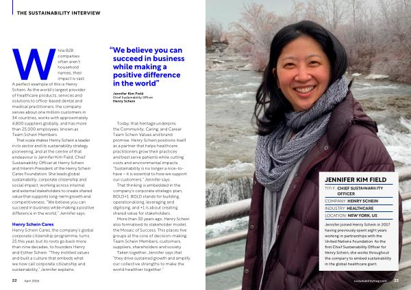 That scale makes Henry Schein a leader in its sector and its sustainability strategy pioneering, and at the centre of that endeavour is Jennifer Kim Field, Chief Sustainability Officer at Henry Schein and Interim President of the Henry Schein Cares Foundation. She leads global sustainability, corporate citizenship and social impact, working across internal and external stakeholders to create shared value that supports long-term growth and competitiveness.“ We believe you can succeed in business while making a positive difference in the world,” Jennifer says.