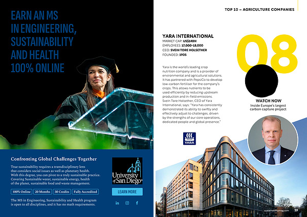 Yara is the world’ s leading crop nutrition company and is a provider of environmental and agricultural solutions. It has partnered with PepsiCo to develop low-carbon fertiliser for the company’ s crops. This allows nutrients to be used efficiently by reducing upstream production and in-field emissions. Svein Tore Holsether, CEO of Yara International, says:“ Yara has consistently demonstrated its ability to swiftly and effectively adjust to challenges, driven by the strengths of our core operations, dedicated people and global presence.”