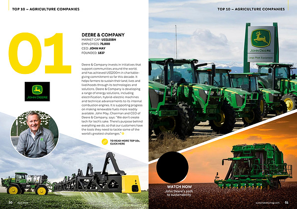 Deere & Company invests in initiatives that support communities around the world, and has achieved US $ 200m in charitablegiving commitment so far this decade. It helps farmers to sustain their land, lives and livelihoods through its technologies and solutions. Deere & Company is developing a range of energy solutions, including electrification, hybrid-electric machines and technical advancements to its internal combustion engines. It is supporting progress on making renewable fuels more readily available. John May, Chairman and CEO of Deere & Company, says:“ We don’ t create tech for tech’ s sake. There’ s purpose behind everything we do, so that our customers have the tools they need to tackle some of the world’ s greatest challenges.”