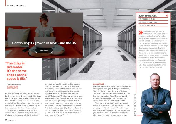 Jonathan Eaves is a veteran data centre builder and tireless evangelist for the future of the edge . He founded Edge Centres – the world ’ s first off-grid data centre company – in 2021 , and is on track to launch 20 sites across Australia and Asia by 2023 . Edge Centres ’ prototype site in Grafton is designed so efficiently as to have zero dependence on the local power grid , meeting all its power needs exclusively with onsite solar and creating more energy than it consumes . As a result , EC1 Grafton was named the winning Edge Data Centre Project of the year 2021 by Data Center Dynamics .