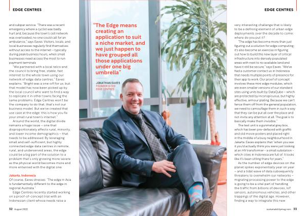 “ We partnered with a local telco and the council to bring free , stable , fast internet to the whole town using our network of edge data centres ,” Eaves explains . “ Bright was a one-off for us , but that model has now been picked up by the local council who want to find a way to replicate it in other towns facing the same problems . Edge Centres won ' t be the company to do that ; that ' s not our business model . But we ' ve created that use case at the edge : this is how you fix your small rural town ' s internet .”