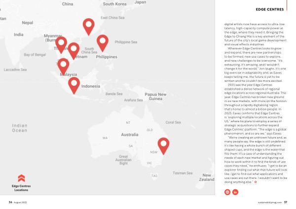 2021 was the year Edge Centres established a dense network of regional edge locations across regional Australia . This year , Edge Centres has broken new ground in six new markets , with more on the horizon throughout a rapidly digitalising region that ’ s home to almost a billion people . In 2023 , Eaves confirms that Edge Centres is “ exploring multiple locations across the US ,” where he plans to employ a series of strategic acquisitions to further expand Edge Centres ’ platform . “ The edge is a global phenomenon , and so are we ,” says Eaves .