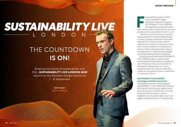 Shaping the future of sustainability and ESG , SUSTAINABILITY LIVE LONDON 2022 returns to the Business Design Centre on 7 - 8 September