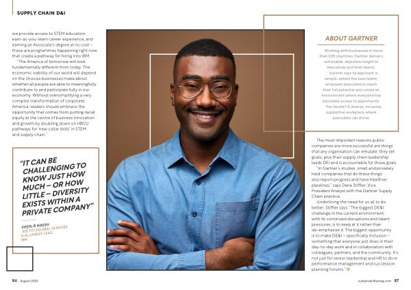 Underlining the need for us all to do better , Stiffler says : “ The biggest DE & I challenge in the current environment , with its continued disruptions and talent pressures , is to keep at it rather than de-emphasise it . The biggest opportunity is to make DE & I – specifically inclusion – something that everyone just does in their day-to-day work and in collaboration with colleagues , partners , and the community . It ’ s not just for senior leadership and HR to do in performance management and succession planning forums .” sustainabilitymag . com 87
