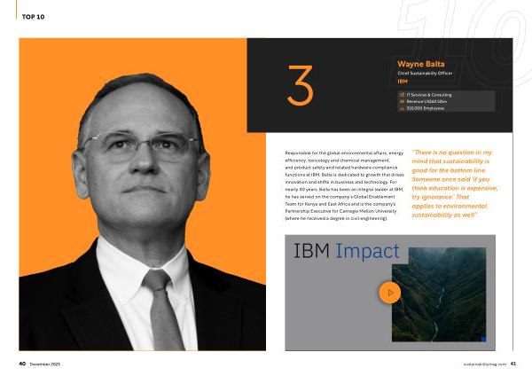 Responsible for the global environmental affairs , energy efficiency , toxicology and chemical management , and product safety and related hardware compliance functions at IBM , Balta is dedicated to growth that drives innovation and shifts in business and technology . For nearly 40 years , Balta has been an integral leader at IBM , he has served on the company ’ s Global Enablement Team for Kenya and East Africa and is the company ’ s Partnership Executive for Carnegie Mellon University ( where he received a degree in civil engineering ).