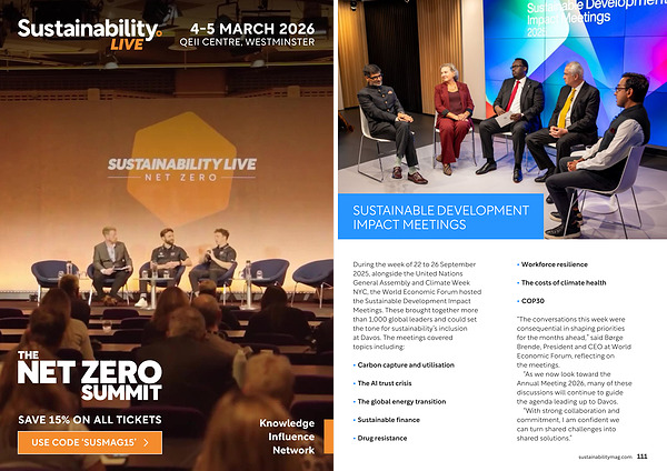 During the week of 22 to 26 September 2025, alongside the United Nations General Assembly and Climate Week NYC, the World Economic Forum hosted the Sustainable Development Impact Meetings. These brought together more than 1,000 global leaders and could set the tone for sustainability’ s inclusion at Davos. The meetings covered topics including: