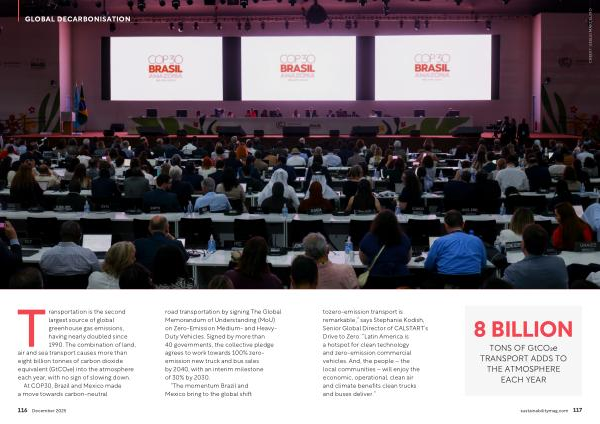 Transportation is the second largest source of global greenhouse gas emissions, having nearly doubled since 1990. The combination of land, air and sea transport causes more than eight billion tonnes of carbon dioxide equivalent( GtCO₂e) into the atmosphere each year, with no sign of slowing down. At COP30, Brazil and Mexico made a move towards carbon-neutral road transportation by signing The Global Memorandum of Understanding( MoU) on Zero-Emission Medium- and Heavy- Duty Vehicles. Signed by more than 40 governments, the collective pledge agrees to work towards 100 % zeroemission new truck and bus sales by 2040, with an interim milestone of 30 % by 2030.