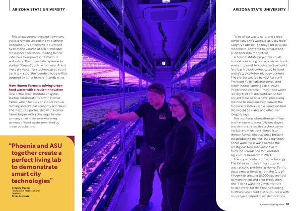 A Zimin Institute project was built around converting post-consumer food waste into a viable, cost-effective liquid fertilizer – a task complicated by food waste’ s typically low nitrogen content. The project was led by ASU Assistant Professor Yujin Park and conducted at her Indoor Farming Lab at ASU’ s Polytechnic campus.“ Most food waste isn’ t by itself a viable fertilizer, so her project focused on a novel processing method to inexpensively convert the food waste into a usable liquid fertilizer that would be viable and effective,” Gregory says.
