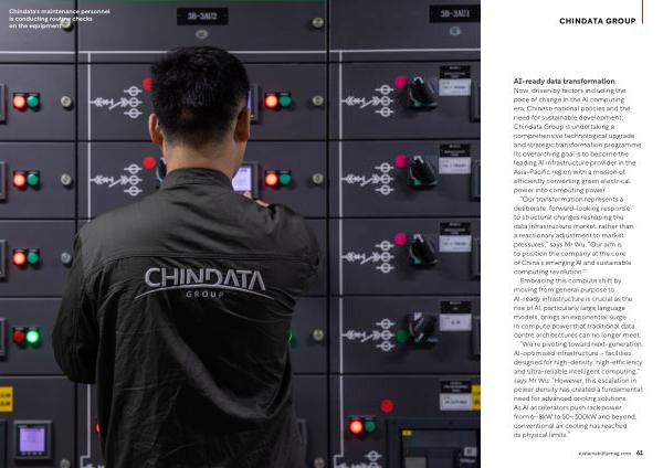 “ We’ re pivoting toward next-generation, AI-optimised infrastructure – facilities designed for high-density, high-efficiency and ultra-reliable intelligent computing,” says Mr Wu.“ However, this escalation in power density has created a fundamental need for advanced cooling solutions. As AI accelerators push rack power from 6 – 8kW to 50 – 300kW and beyond, conventional air cooling has reached its physical limits.” sustainabilitymag. com 61