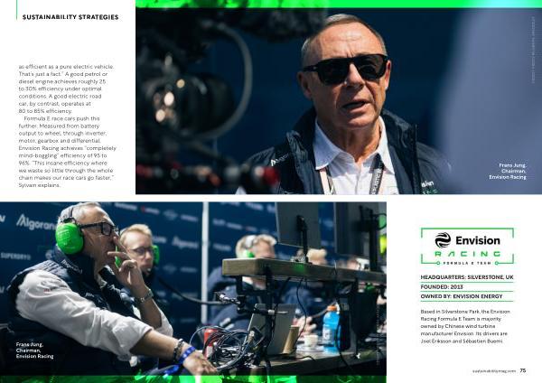 Based in Silverstone Park, the Envision Racing Formula E Team is majority owned by Chinese wind turbine manufacturer Envision. Its drivers are Joel Eriksson and Sébastien Buemi.
