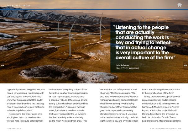 Today , the Nordex Group has several projects underway and is nearing completion on a 95 turbine project in Kansas , a 101 turbine project in Nebraska , and a 16 turbine project in North Dakota . Elsewhere , the firm is set to build its ninth wind farm in Texas . Looking forward , McComas is optimistic