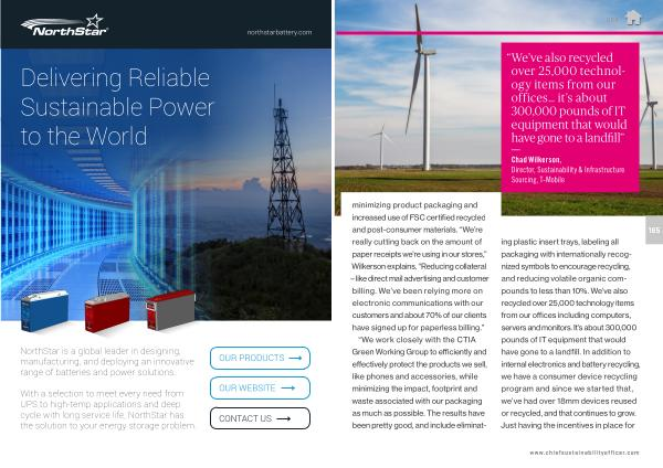 — Chad Wilkerson , Director , Sustainability & Infrastructure Sourcing , T-Mobile minimizing product packaging and increased use of FSC certified recycled and post-consumer materials . “ We ’ re really cutting back on the amount of paper receipts we ’ re using in our stores ,” Wilkerson explains . “ Reducing collateral – like direct mail advertising and customer billing . We ’ ve been relying more on electronic communications with our customers and about 70 % of our clients have signed up for paperless billing .” “ We work closely with the CTIA Green Working Group to efficiently and effectively protect the products we sell , like phones and accessories , while minimizing the impact , footprint and waste associated with our packaging as much as possible . The results have been pretty good , and include eliminat- ing plastic insert trays , labeling all packaging with internationally recognized symbols to encourage recycling , and reducing volatile organic compounds to less than 10 %. We ’ ve also recycled over 25,000 technology items from our offices including computers , servers and monitors . It ’ s about 300,000 pounds of IT equipment that would have gone to a landfill . In addition to internal electronics and battery recycling , we have a consumer device recycling program and since we started that , we ’ ve had over 18mm devices reused or recycled , and that continues to grow . Just having the incentives in place for