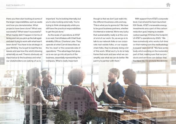 As the scale of operations at AT & T is so vast , Carroll liaises with Chief Sustainability Officer , Charlene Lake . They operate at what Carroll describes as the ‘ inc . level ’ or the corporate side of operations . “ The advantage that gives us is we can go into all parts of the business , essentially representing the company . What ’ s really important