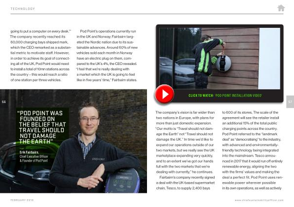 Fairbairn ’ s company recently signed a deal with the UK-based supermarket chain , Tesco , to supply 2,400 bays to 600 of its stores . The scale of the agreement will see the retailer install an additional 15 % of the total public charging points across the country . Pod Point referred to the “ landmark deal ” as “ democratising ” to the industry , with advanced and environmentallyfriendly technology being integrated into the mainstream . Tesco announced in 2017 that it would run off entirely renewable energy , aligning the two with the firms ’ values and making the deal a perfect fit . Pod Point uses renewable power wherever possible in its own operations , as well as actively