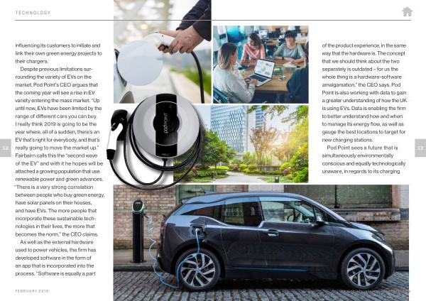 Despite previous limitations surrounding the variety of EVs on the market , Pod Point ’ s CEO argues that the coming year will see a rise in EV variety entering the mass market . “ Up until now , EVs have been limited by the range of different cars you can buy . I really think 2019 is going to be the year where , all of a sudden , there ’ s an EV that ’ s right for everybody , and that ’ s really going to move the market up .” Fairbairn calls this the “ second wave of the EV ” and with it he hopes will be attached a growing population that use renewable power and green advances . “ There is a very strong correlation between people who buy green energy , have solar panels on their houses , and have EVs . The more people that incorporate these sustainable technologies in their lives , the more that becomes the norm ,” the CEO claims .