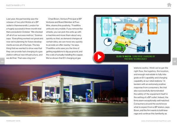Chad Bown , Venture Principal at BP Ventures and Board Member at Free- Wire , shares this positivity . “ FreeWire units are very mobile . If you remove the wheels , you can pick the units up with a machine and move them about very quickly so that , as demand changes at certain sites , we can move very quickly to provide an offer nearby ,” he says . “ FreeWire units save you the time of getting regulations to dig up ground , and the costs of actually installing the copper . We ’ ve shown that EV charging at gas