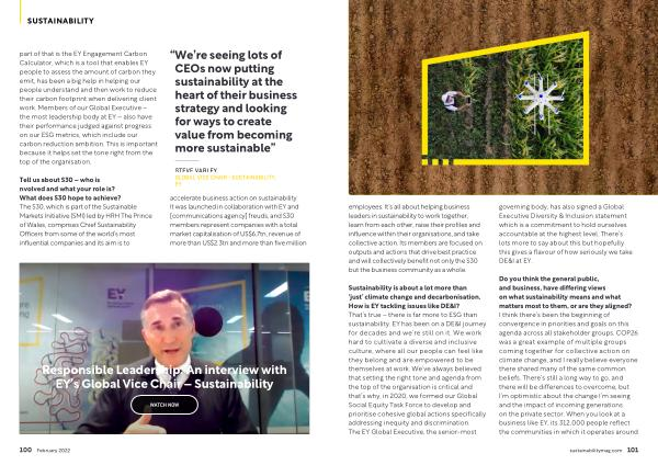 Do you think the general public , and business , have differing views on what sustainability means and what matters most to them , or are they aligned ? I think there ’ s been the beginning of convergence in priorities and goals on this agenda across all stakeholder groups . COP26 was a great example of multiple groups coming together for collective action on climate change , and I really believe everyone there shared many of the same common beliefs . There ’ s still a long way to go , and there will be differences to overcome , but I ’ m optimistic about the change I ’ m seeing and the impact of incoming generations on the private sector . When you look at a business like EY , its 312,000 people reflect the communities in which it operates around