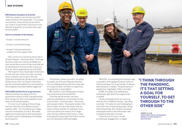 DEBBIE ALLEN GROUP DIRECTOR OF GOVERNANCE , CONDUCT & SUSTAINABILITY , BAE SYSTEMS sustainabilitymag . com 113