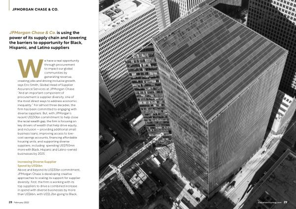 We have a real opportunity through procurement to impact our global communities by generating revenue , creating jobs and driving inclusive growth , says Eric Smith , Global Head of Supplier Assurance Services at JPMorgan Chase . “ And an important component of procurement is supplier diversity , one of the most direct ways to address economic inequality .” For almost three decades , the firm has been committed to engaging with diverse suppliers . But , with JPMorgan ’ s recent US $ 30bn commitment to help close the racial wealth gap , the firm is focusing on key drivers of wealth that help drive equity , and inclusion — providing additional small business loans , improving access to lowcost savings accounts , financing affordable housing units , and supporting diverse suppliers , including spending US $ 750mn more with Black , Hispanic and Latino-owned businesses by 2025 .