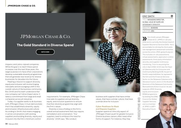 Chase & Co . ( JPMC ) in January 2016 and is currently the Global Head of Supplier Assurance Services ( SAS ). He is accountable for driving the third-party risk management assessment activities across the entire JPMC global footprint . This includes on-site assessments , virtual assessments , application control assessments , third-party information security , and supplier continuous monitoring . Prior to assuming this role in April 2018 , Smith was the Head of Cybersecurity for Consumer and Community Banking ( CCB ). As part of Smith ' s responsibilities , he represents the firm and the Financial Services Sector on the Delaware Cybersecurity Advisory Council , and is on the Board of Directors of the Delaware Community Reinvestment Action Council . He also supports JPMC Diversity , Equity and Inclusion ( DE & I ) programme by leading the DE & I Council for Global Supplier Services , and is a member of JPMC ’ s LGBT + Executive Forum .
