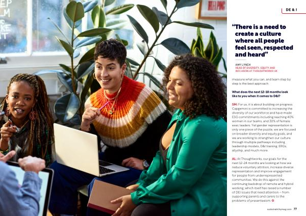 SM : For us , it is about building on progress . Capgemini is committed to increasing the diversity of our workforce and have made ESG commitments including reaching 40 % women in our teams , and 30 % of female exec leaders . Yet gender representation is only one piece of the puzzle , we are focused on broader diversity and equity goals , and we are working to strengthen our culture through multiple pathways including leadership models , D & I training , ERGs , allyship , and much more .
