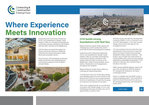 Contracting and Construction Enterprises ( CCE ), was established in Riyadh , Saudi Arabia in 1992 as a privately-owned general contracting company , operating in the Arabian Gulf and other countries of the Middle East . Today its broad portfolio covers hotels , infrastructure and megaprojects throughout the Kingdom .