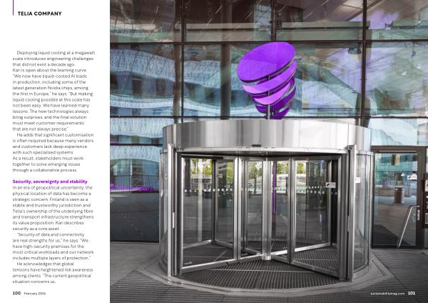 Security, sovereignty and stability In an era of geopolitical uncertainty, the physical location of data has become a strategic concern. Finland is seen as a stable and trustworthy jurisdiction and Telia’ s ownership of the underlying fibre and transport infrastructure strengthens its value proposition. Kari describes security as a core asset.