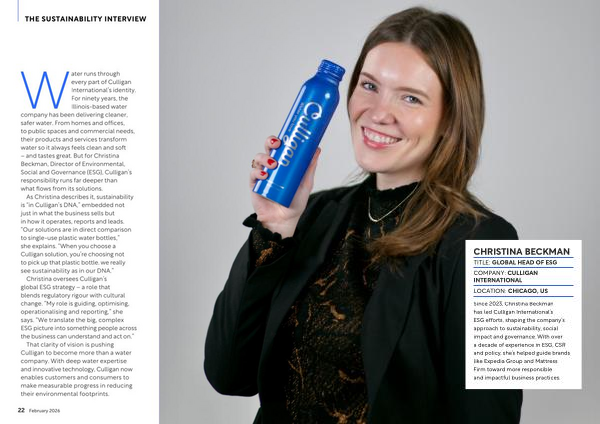 Since 2023, Christina Beckman has led Culligan International’ s ESG efforts, shaping the company’ s approach to sustainability, social impact and governance. With over a decade of experience in ESG, CSR and policy, she’ s helped guide brands like Expedia Group and Mattress Firm toward more responsible and impactful business practices.