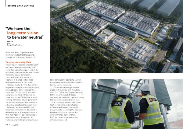 “ We’ re actually the first data centre players in this region massively adopting renewable and solar energies,” he continues.“ Within one of the main campuses we have in Malaysia, we already have over 50 % of the energy coming from solar power generation. So, that is a real example that we are advancing a sustainable energy mix.” However, water availability has become a constraint for data centre development in the region. In light of this, BDC has developed a municipal wastewater recycling project in Malaysia, channelling municipal water