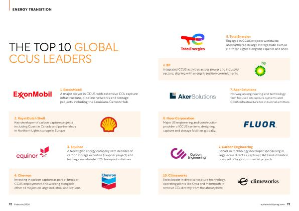 10. Climeworks Swiss leader in direct air capture technology, operating plants like Orca and Mammoth to remove CO₂ directly from the atmosphere. sustainabilitymag. com 73