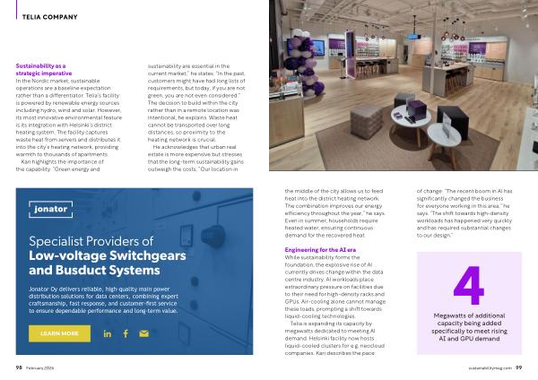 Sustainability as a strategic imperative In the Nordic market, sustainable operations are a baseline expectation rather than a differentiator. Telia’ s facility is powered by renewable energy sources including hydro, wind and solar. However, its most innovative environmental feature is its integration with Helsinki’ s district heating system. The facility captures waste heat from servers and distributes it into the city’ s heating network, providing warmth to thousands of apartments. Kari highlights the importance of the capability.“ Green energy and sustainability are essential in the current market,” he states.“ In the past, customers might have had long lists of requirements, but today, if you are not green, you are not even considered.” The decision to build within the city rather than in a remote location was intentional, he explains. Waste heat cannot be transported over long distances, so proximity to the heating network is crucial.