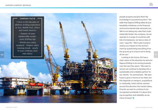 people properly and give them the knowledge to succeed long-term .” Siri adds that Sapura Drilling takes its sustainability initiatives on the financial and environmental side seriously too . “ We ’ re not taking any risks that could materially hinder the company . As we operate in a range of countries with lots of employees , we have a duty of care ,” says Siri . “ We ’ re also trying to reduce our impact on the environment by questioning everything from the ground up to ensure we ’ re doing all we can .”