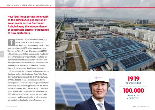 Spearheading the company ’ s efforts to advance its global footprint in Southeast Asia , Total Solar Distributed Generation ’ s CEO ( SEA ) Gavin Adda brings a decade of experience in the industry from a previous role working on major projects for Samsung . “ I could see big potential for the future here in Southeast Asia ,” recalls Adda . “ There are many islands with complicated terrain where it ’ s difficult to put a grid down . You ’ ve got great solar resources - and the exciting thing is that you can co-locate it and put solar where the usage is .