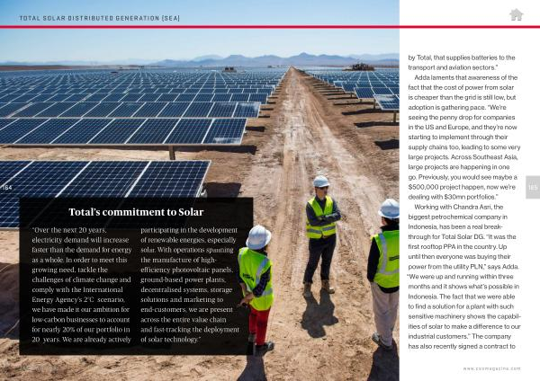 Working with Chandra Asri , the biggest petrochemical company in Indonesia , has been a real breakthrough for Total Solar DG . “ It was the first rooftop PPA in the country . Up until then everyone was buying their power from the utility PLN ,” says Adda . “ We were up and running within three months and it shows what ’ s possible in Indonesia . The fact that we were able to find a solution for a plant with such sensitive machinery shows the capabilities of solar to make a difference to our industrial customers .” The company has also recently signed a contract to
