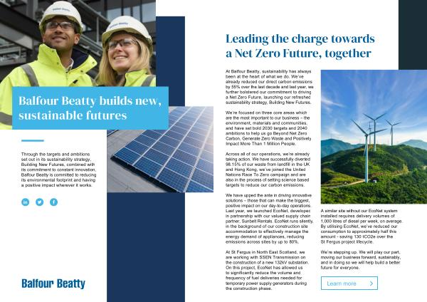 At Balfour Beatty , sustainability has always been at the heart of what we do . We ’ ve already reduced our direct carbon emissions by 55 % over the last decade and last year , we further bolstered our commitment to driving a Net Zero Future , launching our refreshed sustainability strategy , Building New Futures .