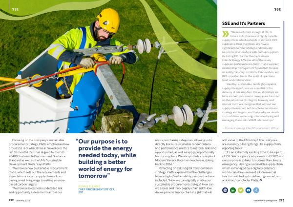 Focusing on the company ’ s sustainable procurement strategy , Platts emphasises how proud SSE is of what it has achieved over the last 18 months . “ SSE has aligned to the ISO 20400 Sustainable Procurement Guidance Standard as well as the UN ’ s Sustainable Development Goals ,” says Platts .