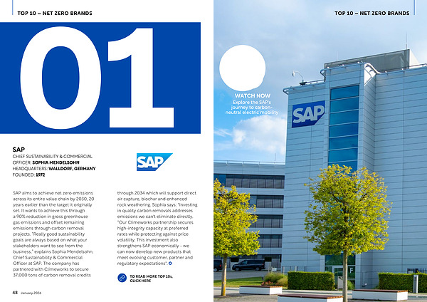 SAP aims to achieve net zero emissions across its entire value chain by 2030, 20 years earlier than the target it originally set. It wants to achieve this through a 90 % reduction in gross greenhouse gas emissions and offset remaining emissions through carbon removal projects.“ Really good sustainability goals are always based on what your stakeholders want to see from the business,” explains Sophia Mendelsohn, Chief Sustainability & Commercial Officer at SAP. The company has partnered with Climeworks to secure 37,000 tons of carbon removal credits through 2034 which will support direct air capture, biochar and enhanced rock weathering. Sophia says: " Investing in quality carbon removals addresses emissions we can ' t eliminate directly.“ Our Climeworks partnership secures high-integrity capacity at preferred rates while protecting against price volatility. This investment also strengthens SAP economically- we can now develop new products that meet evolving customer, partner and regulatory expectations ".