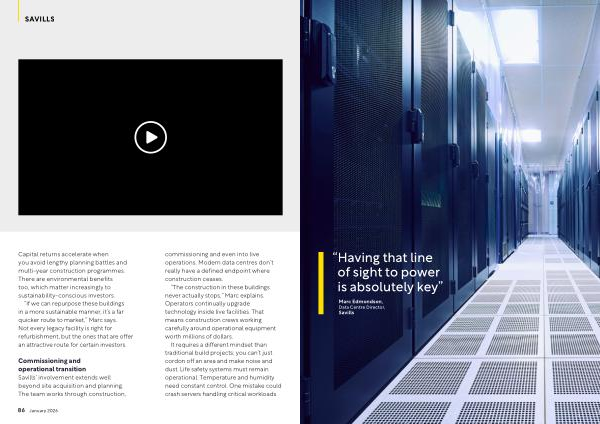 Commissioning and operational transition Savills’ involvement extends well beyond site acquisition and planning. The team works through construction, commissioning and even into live operations. Modern data centres don’ t really have a defined endpoint where construction ceases.