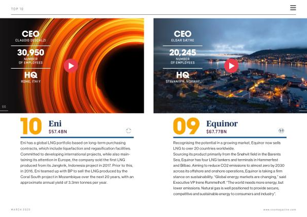 $ 57.4BN Eni has a global LNG portfolio based on long-term purchasing contracts , which include liquefaction and regasification facilities . Committed to developing international projects , while also maintaining its attention in Europe , the company sold the first LNG produced from its Jangkrik , Indonesia project in 2017 . Prior to this , in 2016 , Eni teamed up with BP to sell the LNG produced by the Coral South project in Mozambique over the next 20 years , with an approximate annual yield of 3.3mn tonnes per year .