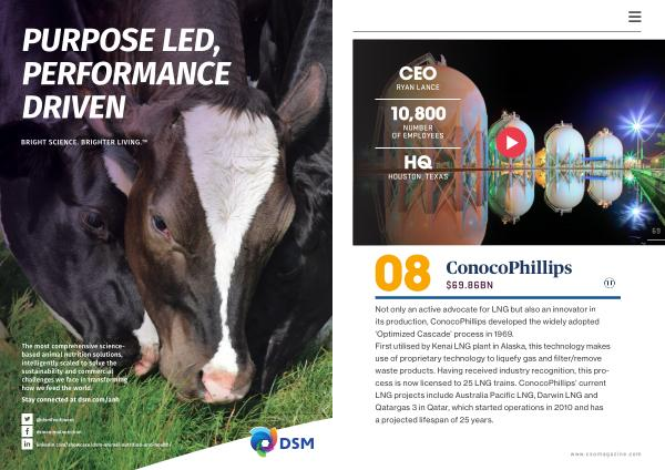 $ 69.86BN Not only an active advocate for LNG but also an innovator in its production , ConocoPhillips developed the widely adopted ‘ Optimized Cascade ’ process in 1969 . First utilised by Kenai LNG plant in Alaska , this technology makes use of proprietary technology to liquefy gas and filter / remove waste products . Having received industry recognition , this process is now licensed to 25 LNG trains . ConocoPhillips ’ current LNG projects include Australia Pacific LNG , Darwin LNG and Qatargas 3 in Qatar , which started operations in 2010 and has a projected lifespan of 25 years . www . csomagazine . com