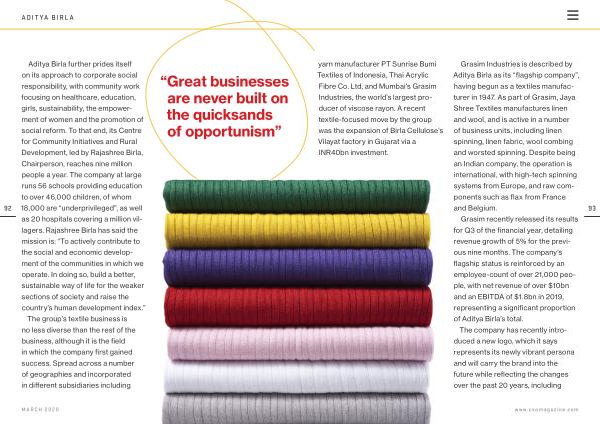 yarn manufacturer PT Sunrise Bumi Textiles of Indonesia , Thai Acrylic Fibre Co . Ltd , and Mumbai ’ s Grasim Industries , the world ’ s largest producer of viscose rayon . A recent textile-focused move by the group was the expansion of Birla Cellulose ’ s Vilayat factory in Gujarat via a INR40bn investment .