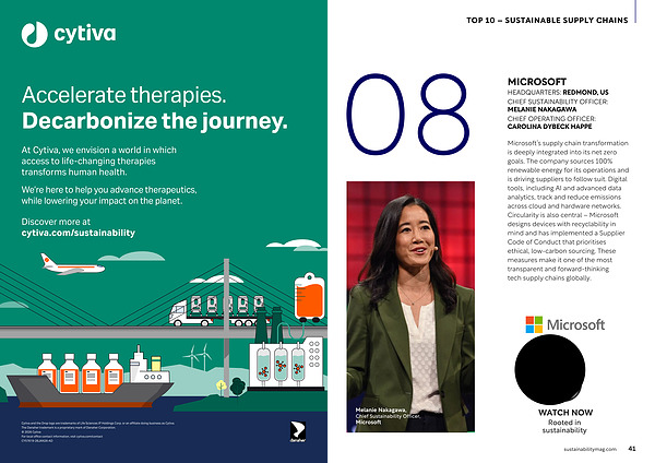 Microsoft’ s supply chain transformation is deeply integrated into its net zero goals. The company sources 100 % renewable energy for its operations and is driving suppliers to follow suit. Digital tools, including AI and advanced data analytics, track and reduce emissions across cloud and hardware networks. Circularity is also central – Microsoft designs devices with recyclability in mind and has implemented a Supplier Code of Conduct that prioritises ethical, low‐carbon sourcing. These measures make it one of the most transparent and forward‐thinking tech supply chains globally. Melanie Nakagawa, Chief Sustainability Officer, Microsoft