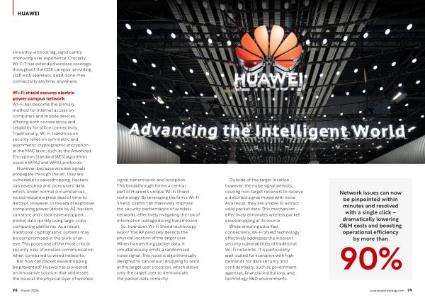 signal transmission and reception. This breakthrough forms a central part of Huawei’ s unique Wi-Fi Shield technology. By leveraging the firm’ s Wi-Fi Shield, clients can massively improve the security performance of wireless networks, effectively mitigating the risk of information leakage during transmission.