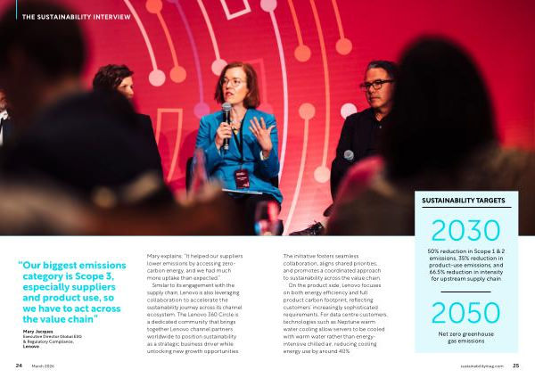 On the product side, Lenovo focuses on both energy efficiency and full product carbon footprint, reflecting customers’ increasingly sophisticated requirements. For data centre customers, technologies such as Neptune warm water cooling allow servers to be cooled with warm water rather than energyintensive chilled air, reducing cooling energy use by around 40 %.