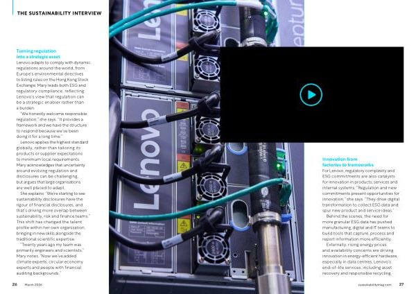 Turning regulation into a strategic asset Lenovo adapts to comply with dynamic regulations around the world, from Europe’ s environmental directives to listing rules on the Hong Kong Stock Exchange. Mary leads both ESG and regulatory compliance, reflecting Lenovo’ s view that regulation can be a strategic enabler rather than a burden.